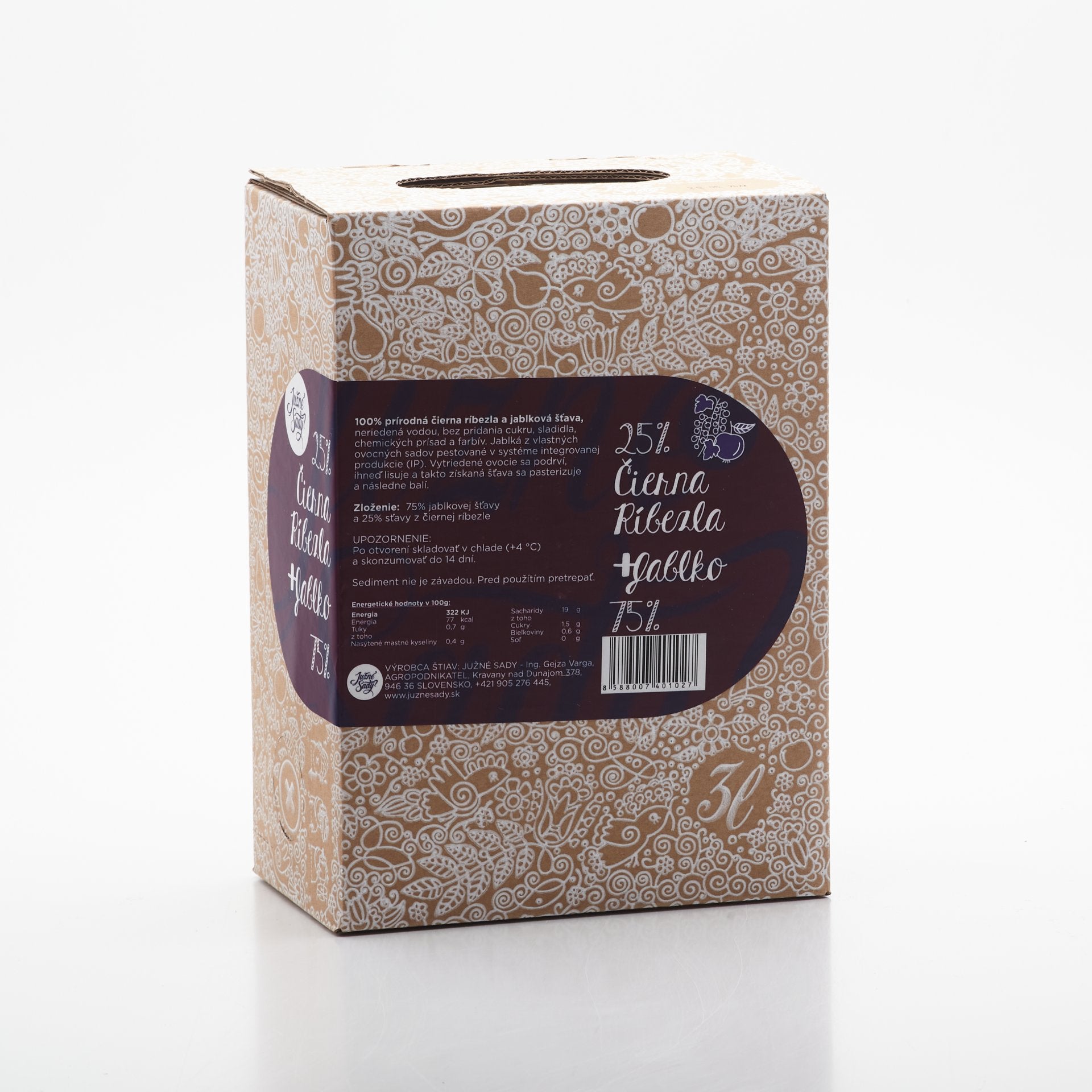 100% prírodná jablková šťava, neriedená vodou, bez chemických prísad a farbív. Jablká z vlastných ovocných sadov pestované v systéme integrovanej produkcie. Šetrná pasterizácia. 25% podiel ríbezlovej šťavy.