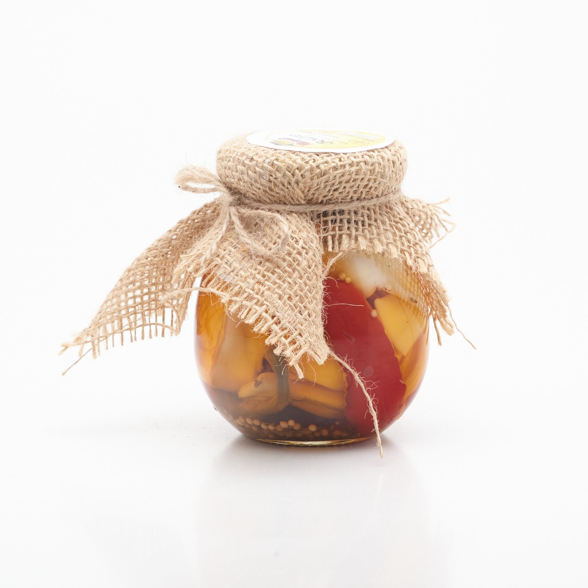 Syr marinovaný v repkovom oleji s vybranými druhmi korenia a sterilizované zeleniny v sympatických pohároch.