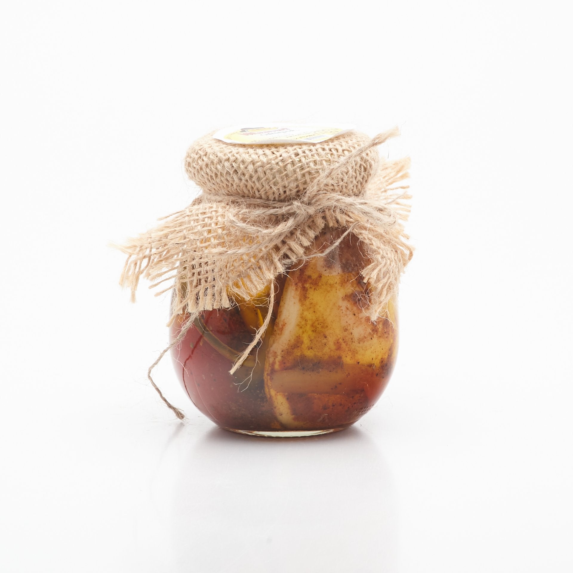 Syr marinovaný v repkovom oleji s vybranými druhmi korenia a sterilizované zeleniny v sympatických pohároch.