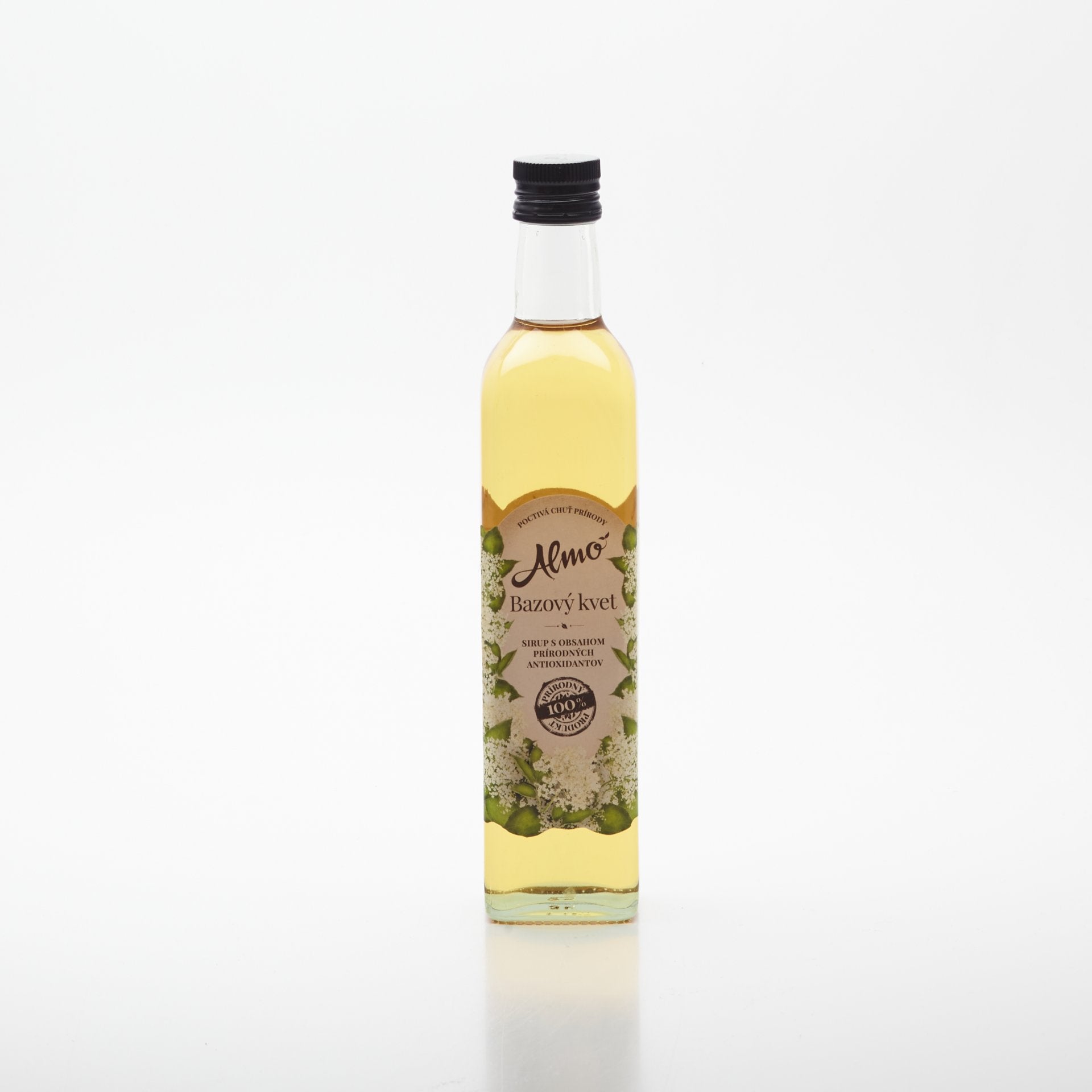 Sirup z bazového kvetu. Prírodný produkt vyrobený bez chemických prísad a umelých sladidiel. Pasterizovaný.